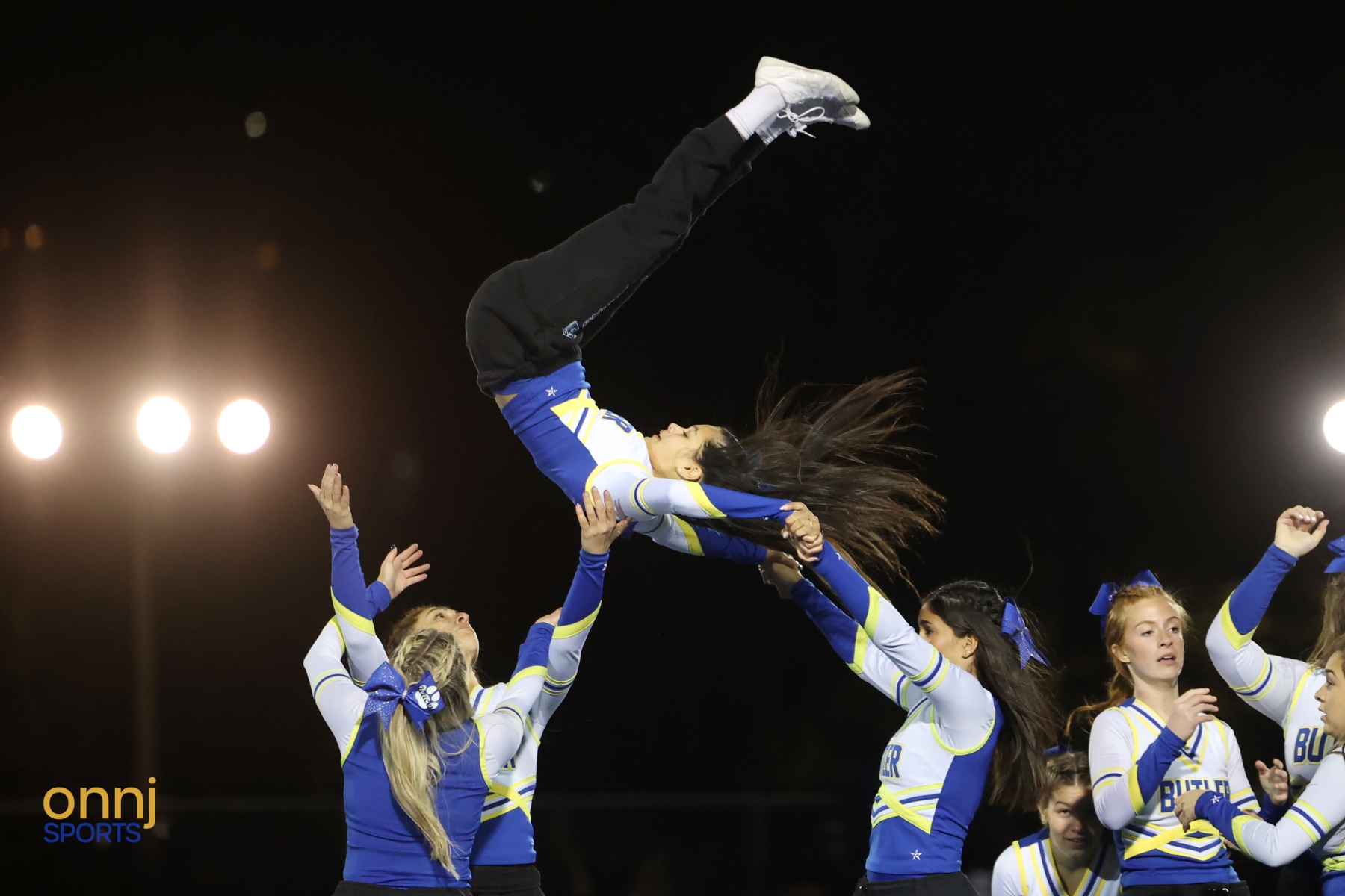 The Butler cheerleaders perform during halftime of a 2024 NJSIAA North Jersey, Section 1, Group 1 football championship game between Butler and Mountain Lakes. (Photo by Christopher Shannon/OnNJ Sports)