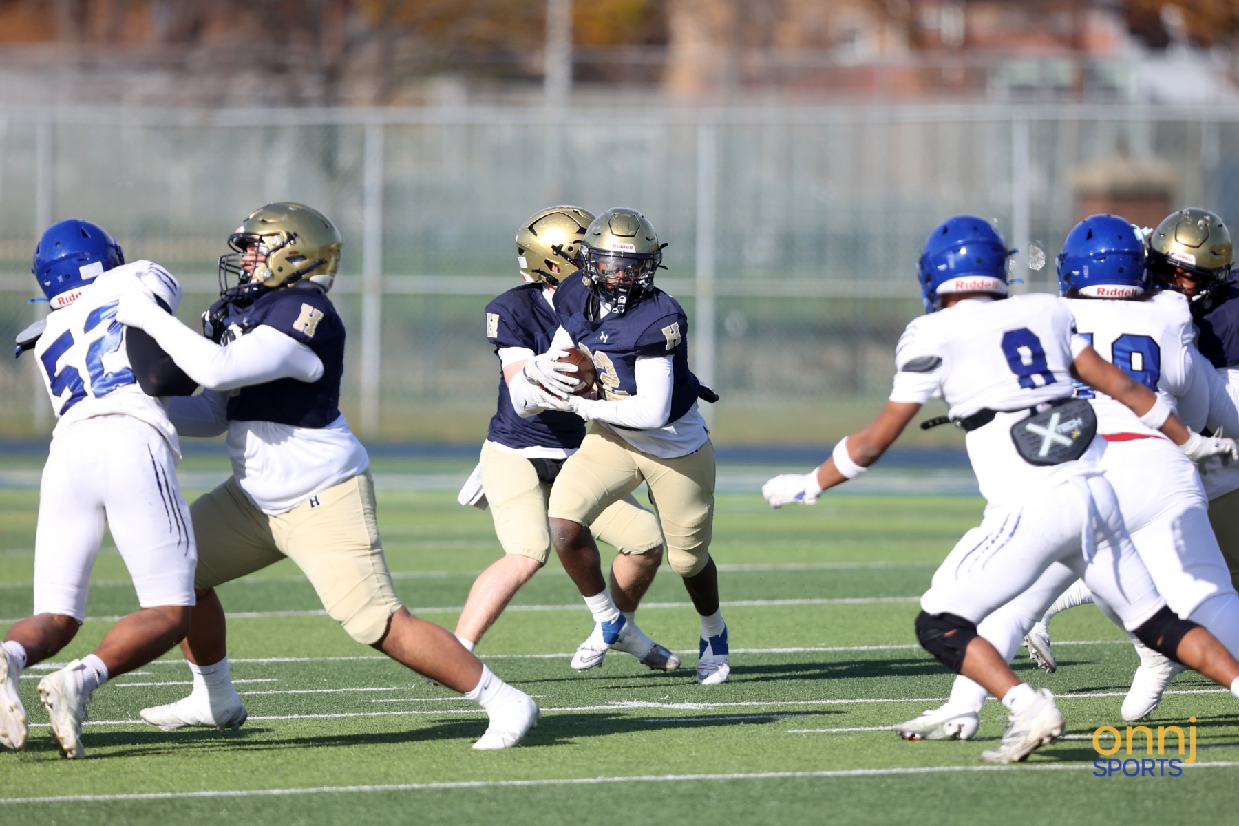 Action from a Thanksgiving Day high school football game between Hackensack and Teaneck. (Photo by Christopher Shannon/OnNJ Sports)