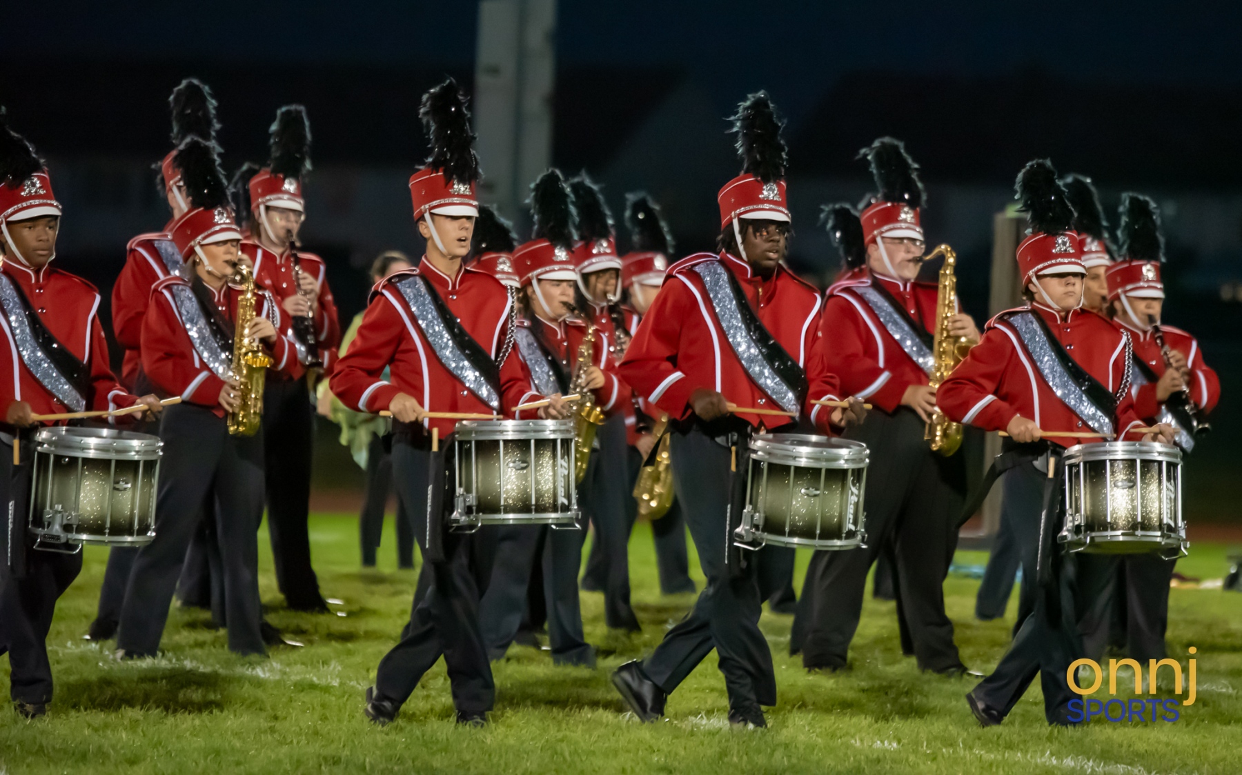 The Jackson Township marching band performs during halftime of a high school football game between Jackson Township and Manalapan on Sept. 12, 2025. (Photo by Michael Franco/OnNJ Sports)