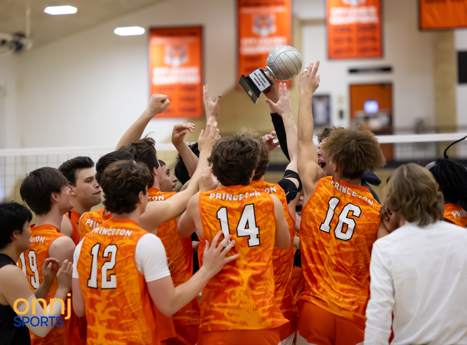 The Princeton men's volleyball celebrates their victory over Harvard on April 12, 2025. (Photo by Andee Fagan/OnNJ Sports)