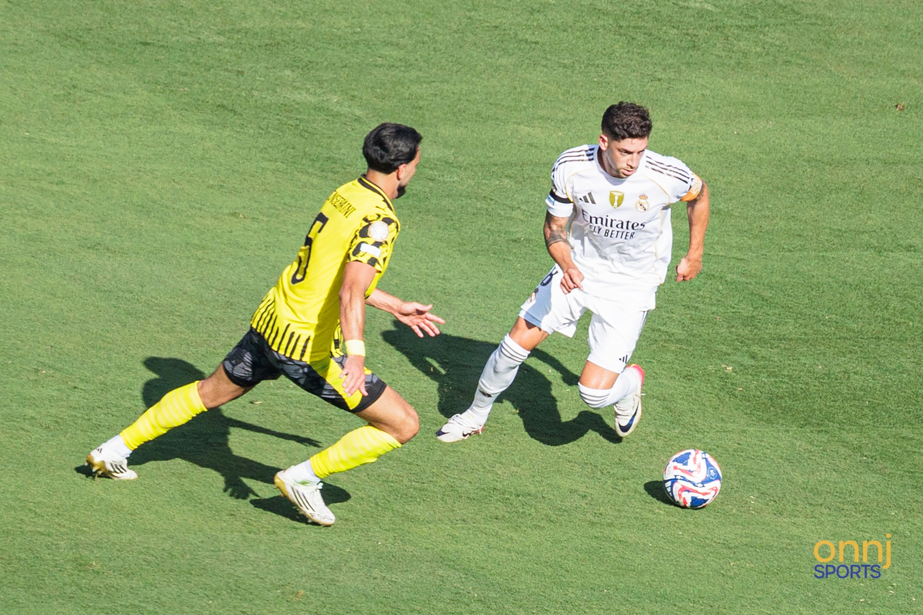 Action from a 2025 FIFA Club World Cup quarterfinal match between Real Madrid and Borussia Dortmund. (Photo by Dmitriy Piyevskiy/OnNJ Sports)